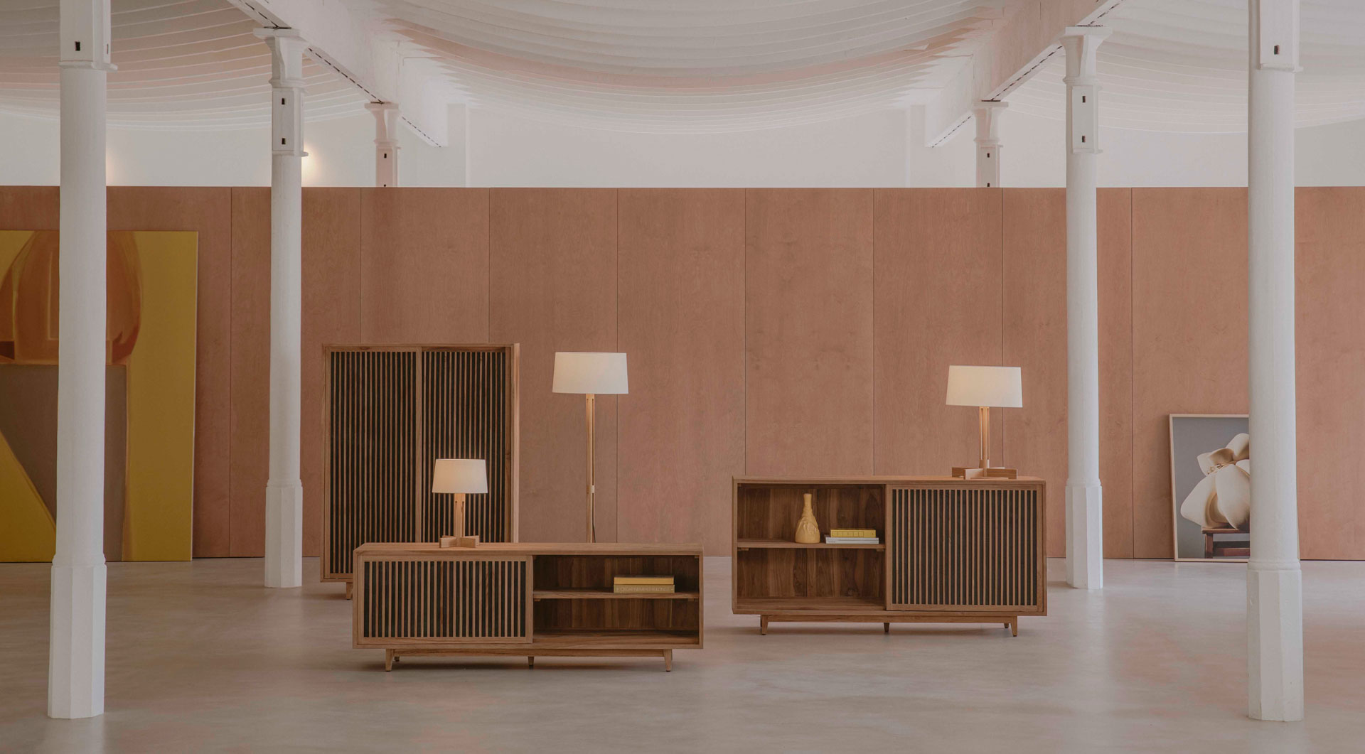 Moble TV i bufet alt Merapi de PLM Design, llum de peu i sobretaula FAD de Santa & Cole.